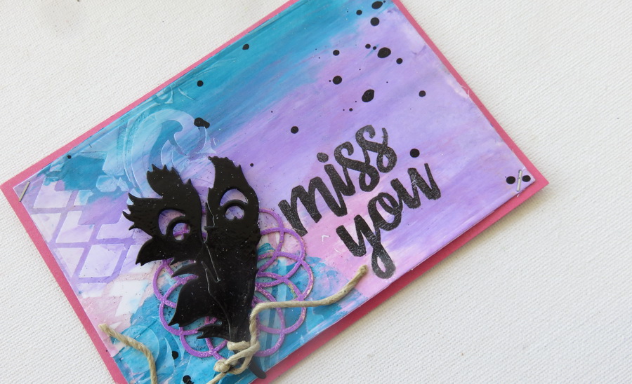 This first card was made with RB Jamboree medium stencil using gel medium as a medium under the stencil. First I stamped the sentiment with pigmented ink and heat embossed it with black embossing powder. I used My Favorite Things sentiment set as those sentiments are big and visible.Then I added the texture with stencil and gel medium and as this stencil has an oval gap in the middle , I just added medium around the gap and not inside it. I added mists from Tattered Angels (three colors, not more, unless you want to get a brown mess) and also dried each mist layer between the misting to avoid the mess. The stamped and stencilled panel was arranged over another layer and then arranged into Kraft base card. The natural twine was glued with the same gel medium to stay on its place as shown.